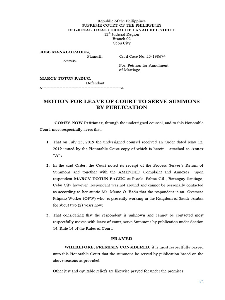 Motion For Leave To Serve Summons by Publication PDF Annulment