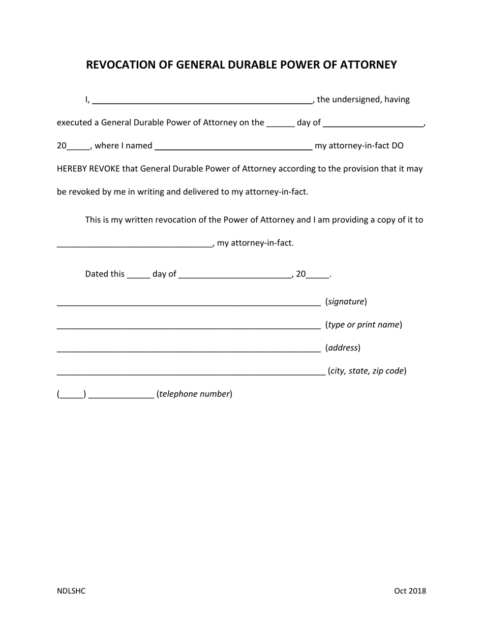 North Dakota Revocation of General Durable Power of Attorney Fill Out