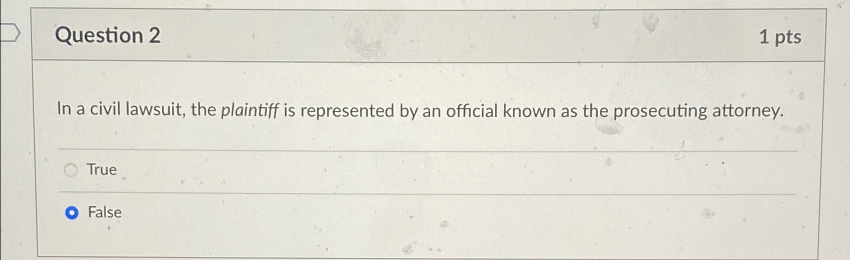Solved Question 21ptsIn a civil lawsuit the plaintiff is Chegg com