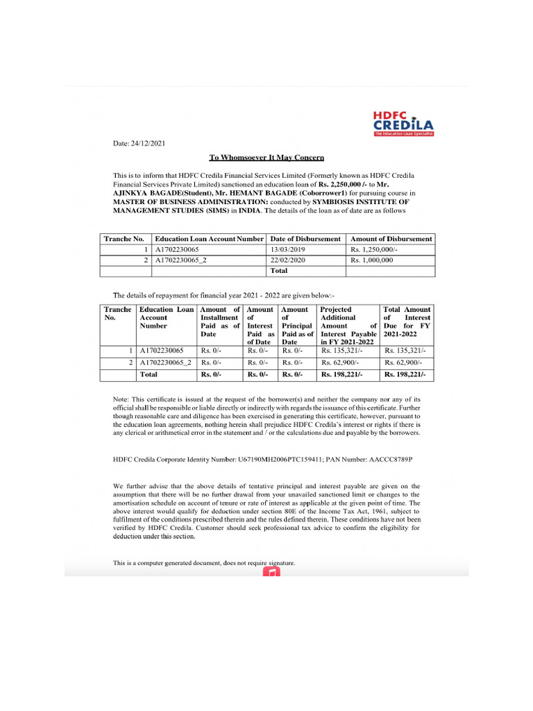 HOME LOAN INTEREST CERTIFICATE For FY 2021 22 PDF Loans Interest