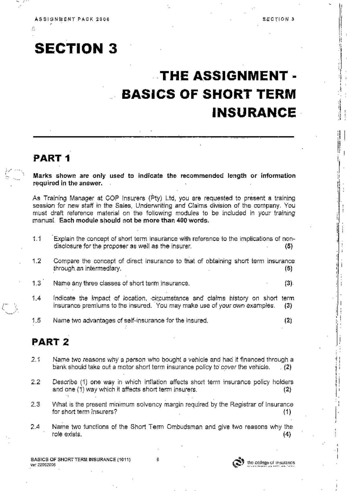 Question paper short term QUESTION PAPER SHORT TERM INSURANCE