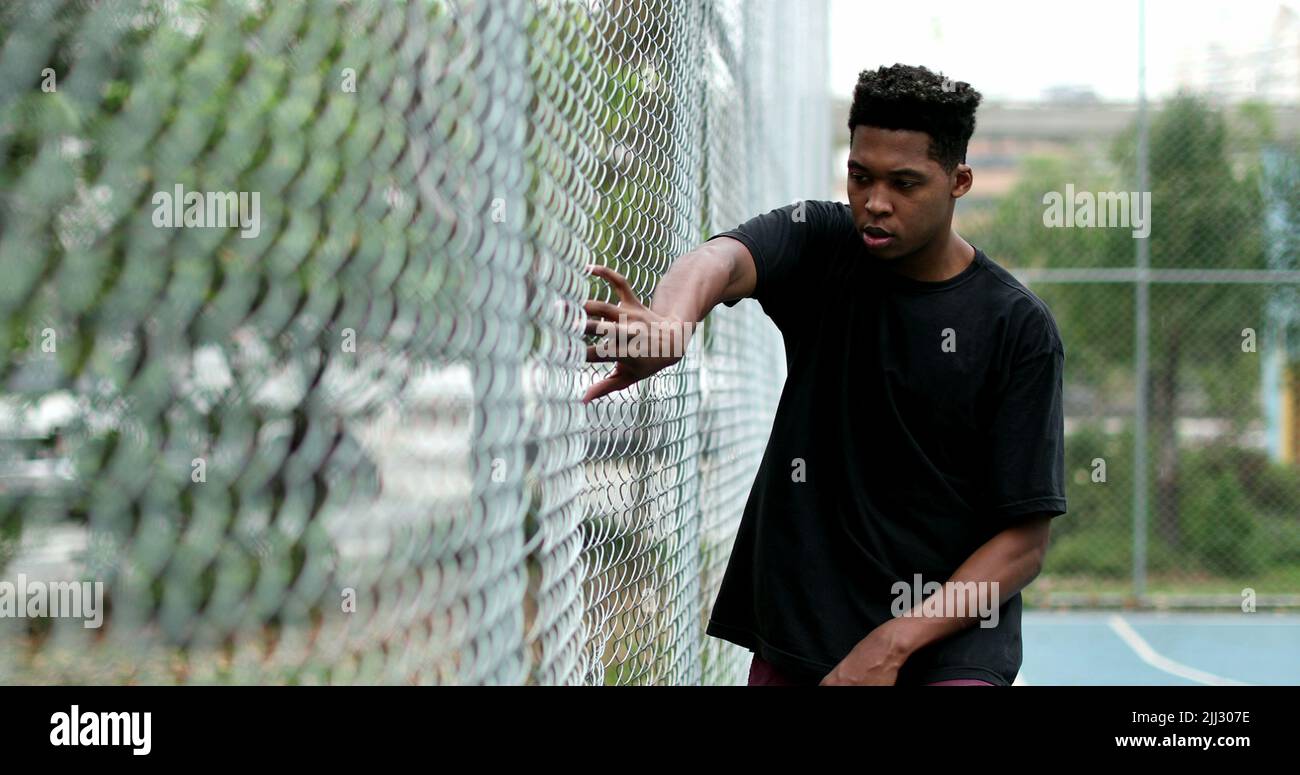 Black guy at basketball court holding into metal fence posing Stock