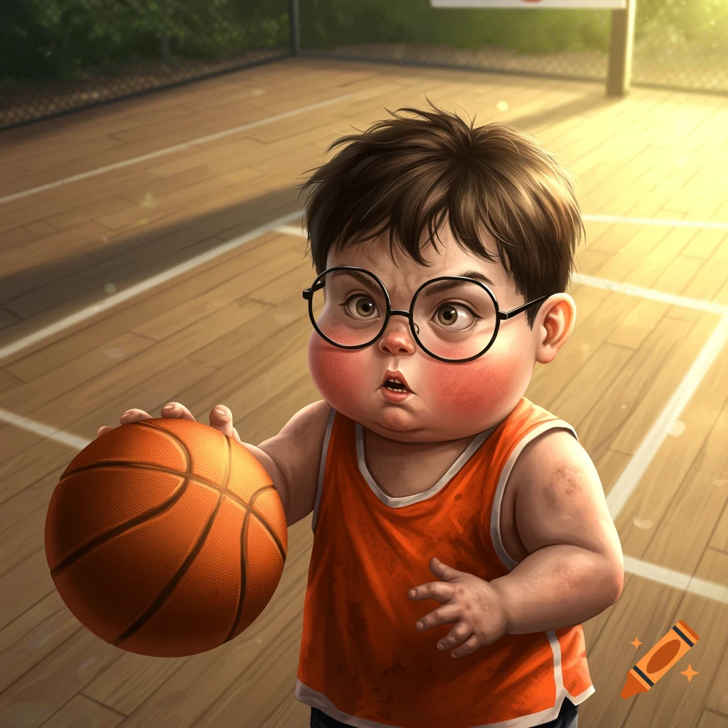 Cartoon boy with glasses holding a basketball on a court on Craiyon