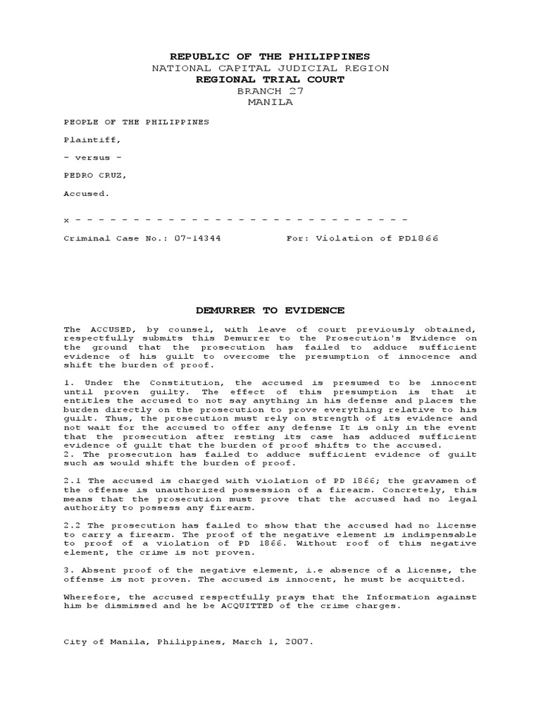 Demurrer To Evidence Sample Form PDF Burden Of Proof (Law) Evidence