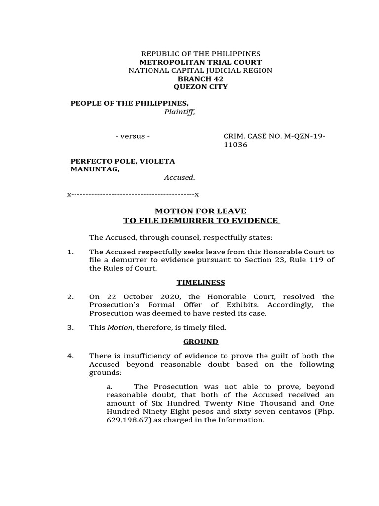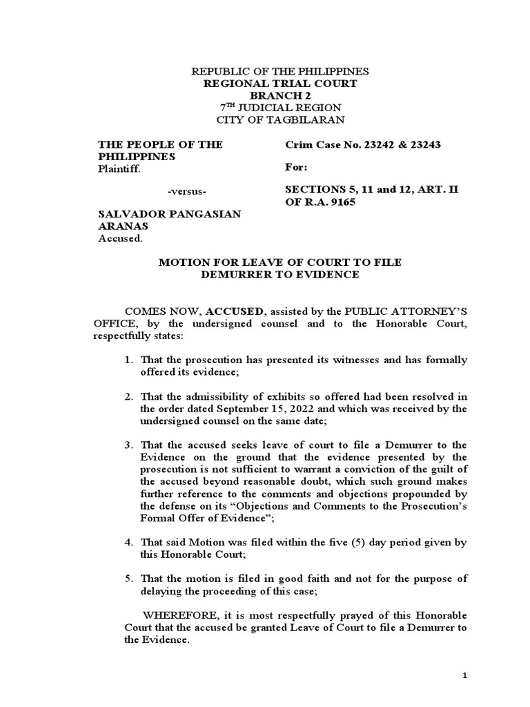 Motion For Leave of Court To File Demurrer To Evidence PDF