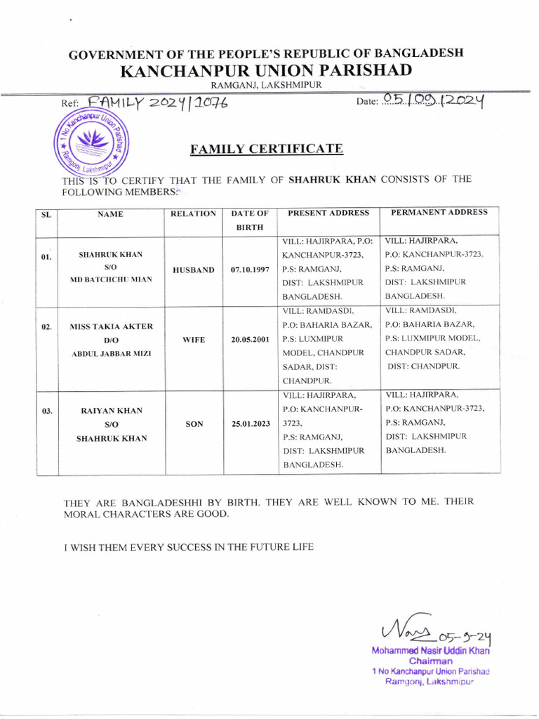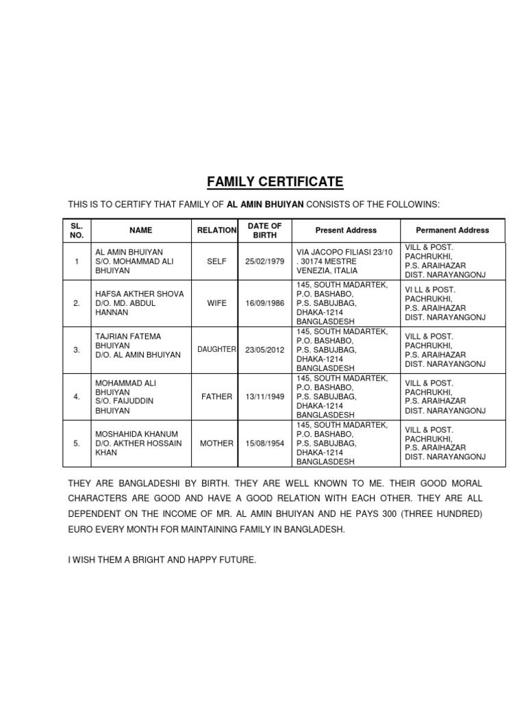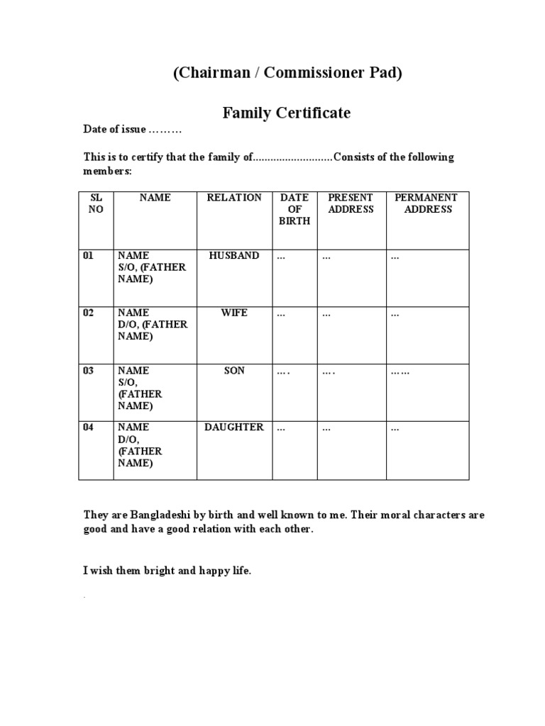 Family Certificate Sample in Bangladesh In Word Format পারিবারিক সনদ