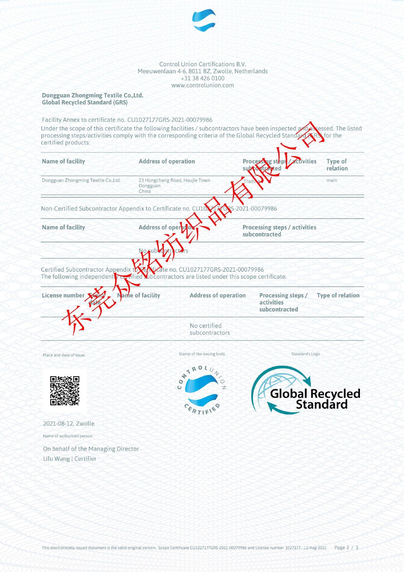 Global Recycle Standard (GRS) 4 0 certification continue obtained
