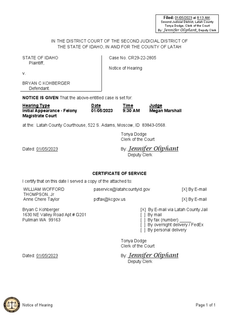 Notice of Hearing (Criminal) For Bryan Kohberger PDF Law Of The