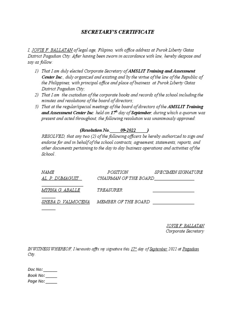 Secretarys Certificate BIR Books of Account AGAPP PDF