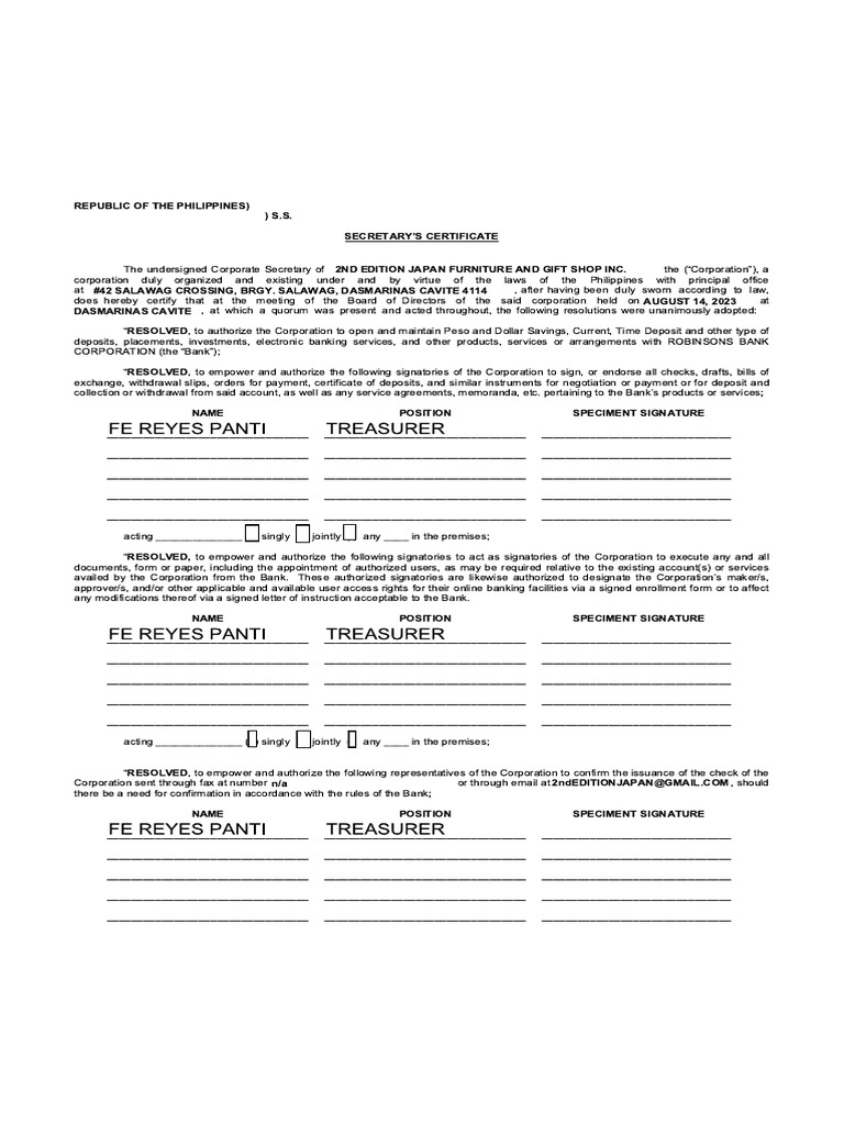 Secretarys Certificate For Account Opening Domestic Corporation PDF