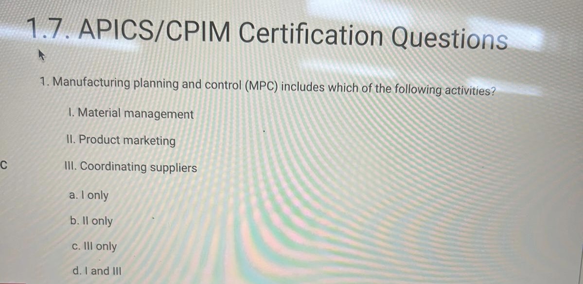 Solved 1 7 APICS/CPIM Certification QuestionsManufacturing Chegg com