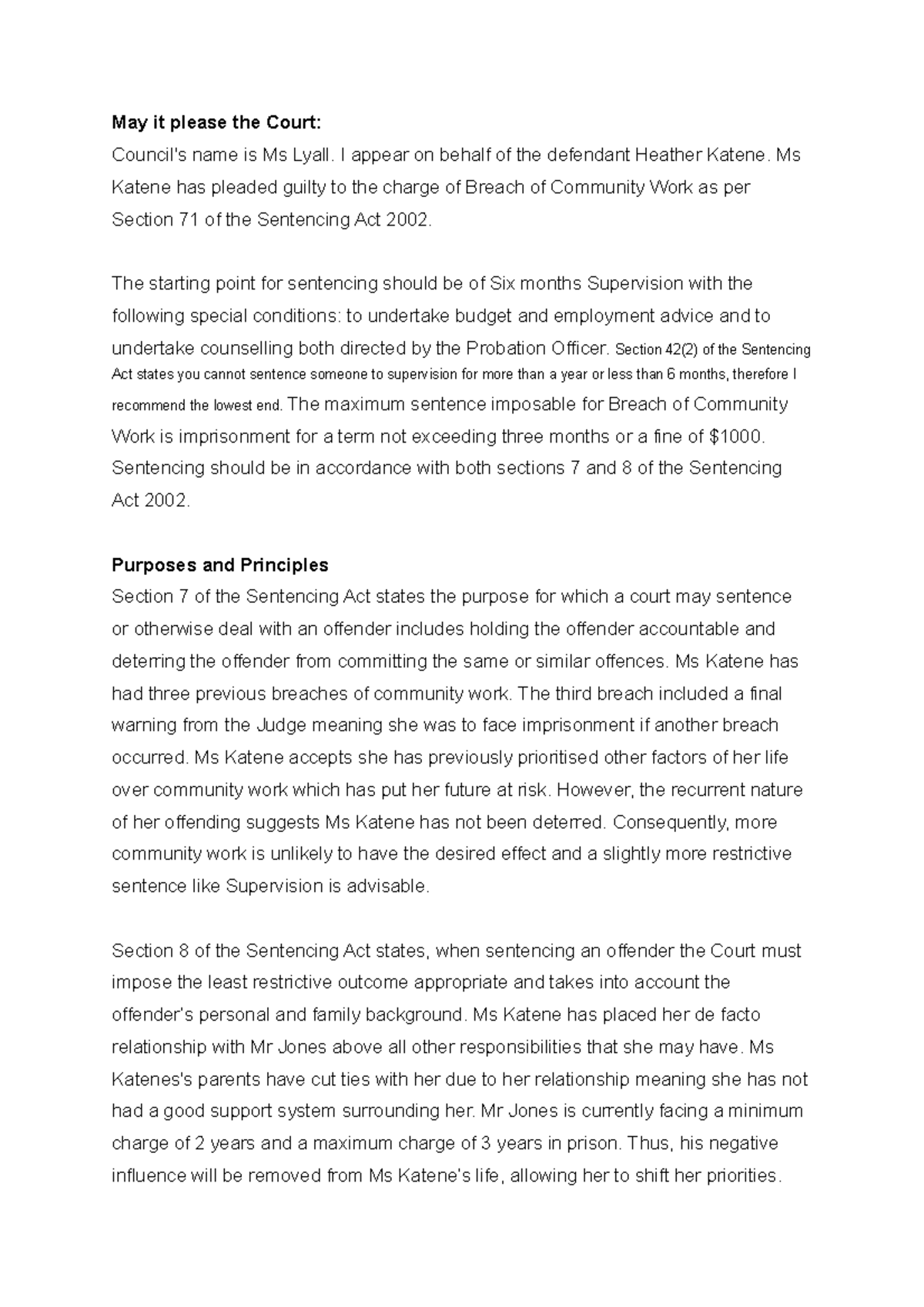 Plea in Mitigation Script for Court on Sentencing: Ms Woods Case