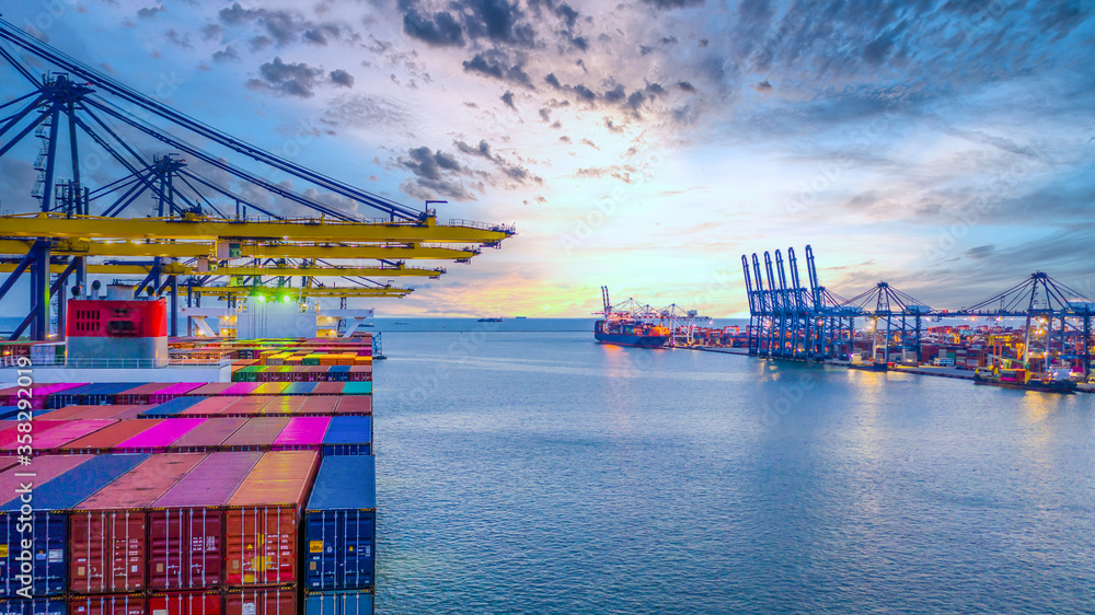 Container ship unloading in deep sea port Global business logistic