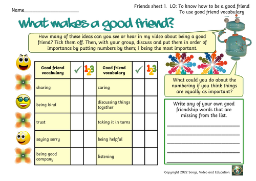 What Makes a Good Friend? Worksheet song and video Teaching Resources
