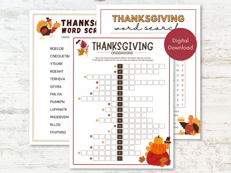 Thanksgiving Crossword Puzzle Printable Worksheet Game kids Adults