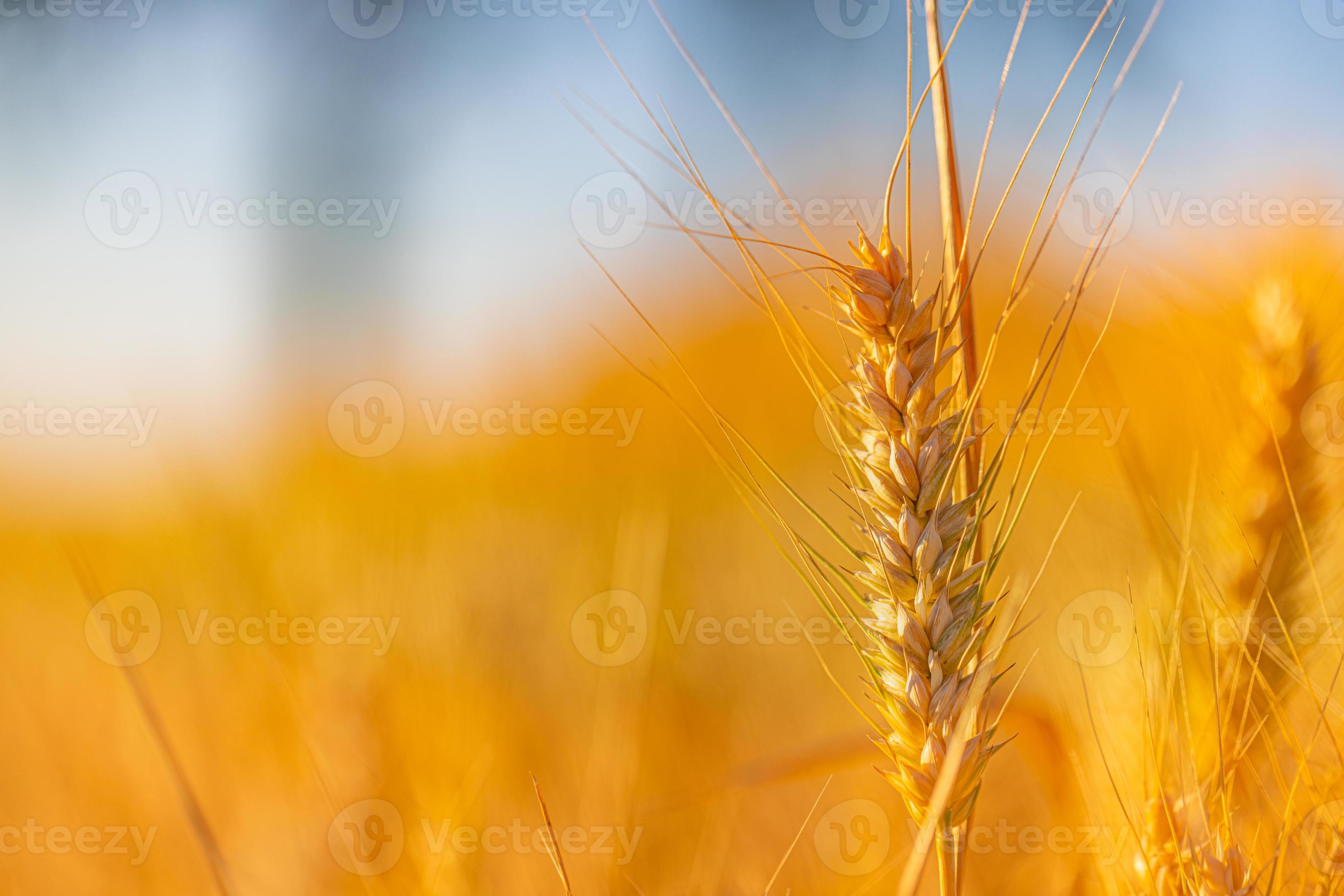 Wheat field sunset Ears of golden wheat closeup Rural scenery under