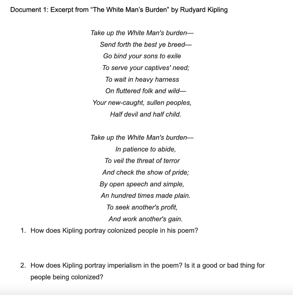 Rudyard Kipling #39 s White Man #39 s Burden DBQ Worksheet Student Handouts