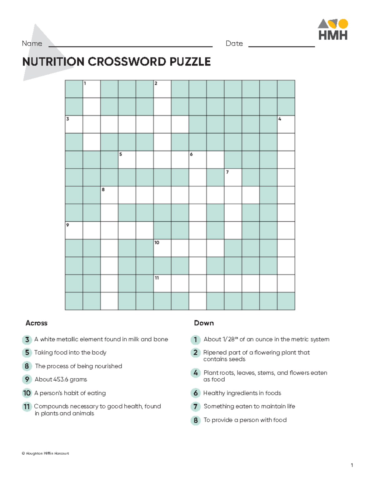 Nutrition crossword puzzle Name Date 1 Across A white metallic
