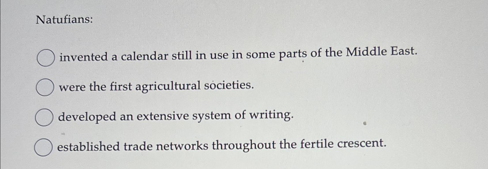 Solved Natufians:invented a calendar still in use in some Chegg com
