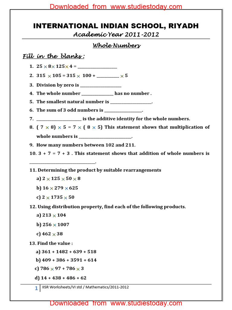 Whole Numbers Worksheet For Class 6
