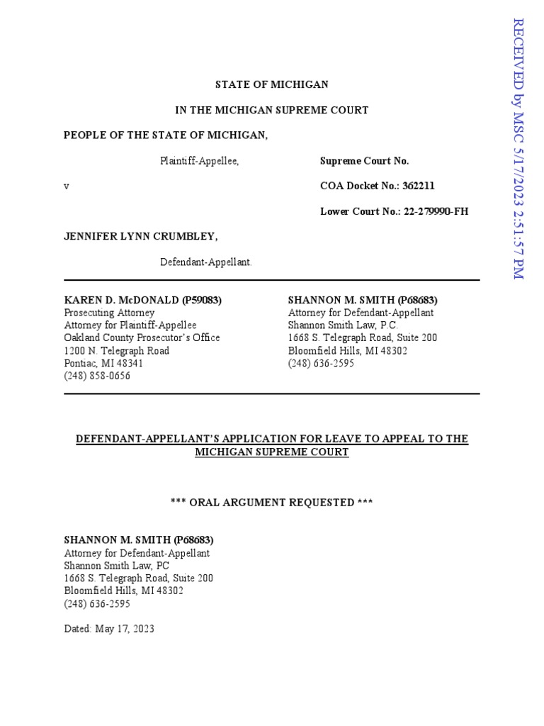 Appeal To Michigan Supreme Court PDF