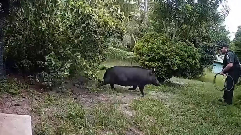 Video shows deputies trying to wrangle a wild boar after it crashed