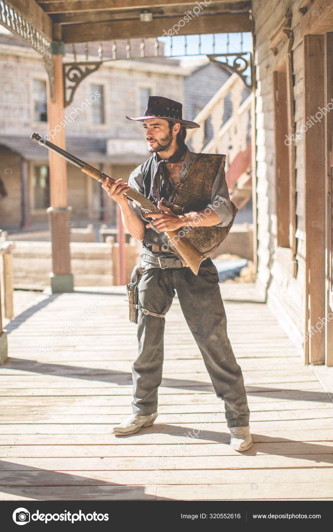 Portrait Cowboy Holding Shotgun Wild West Film Set Fort Bravo Stock