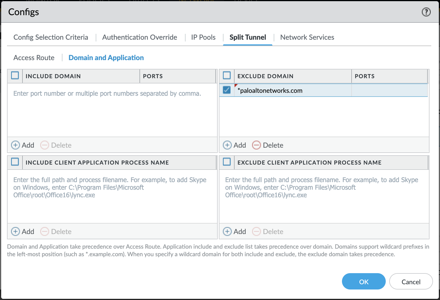 Wildcard Support for Split Tunnel Settings Based on the Application