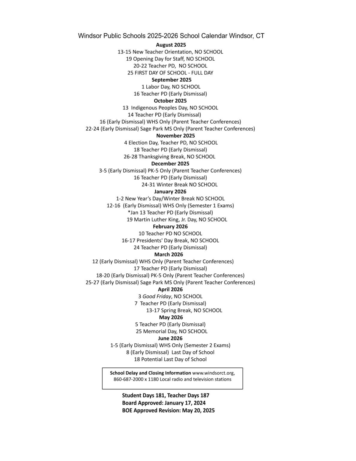 Windsor Public Schools CT Calendar 25 26 Revised pdf EduCounty