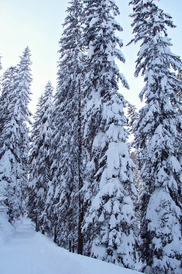 Tranquil winter scene featuring tall snow covered pines Free Stock