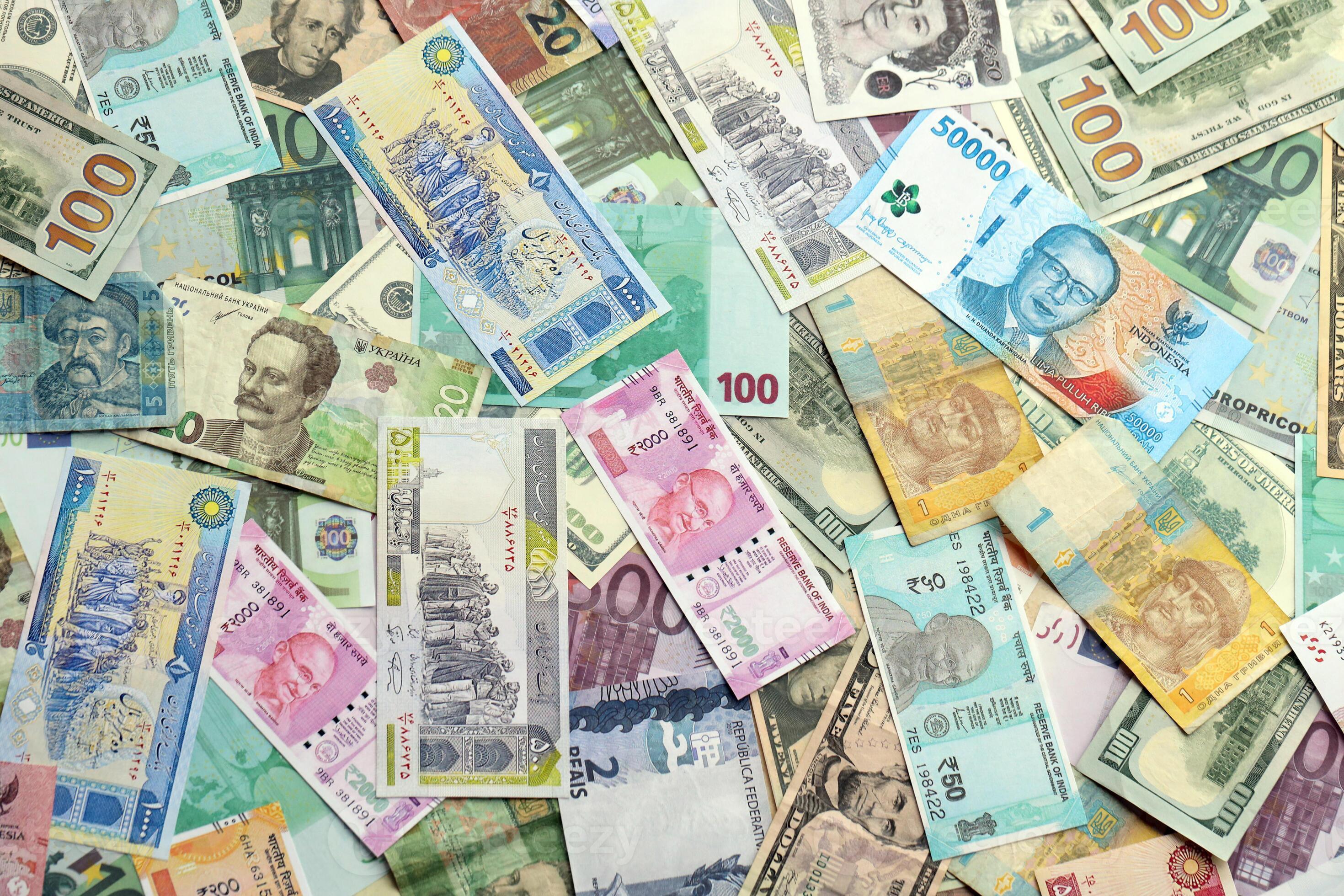 Many banknotes of different currency Background of big amount of