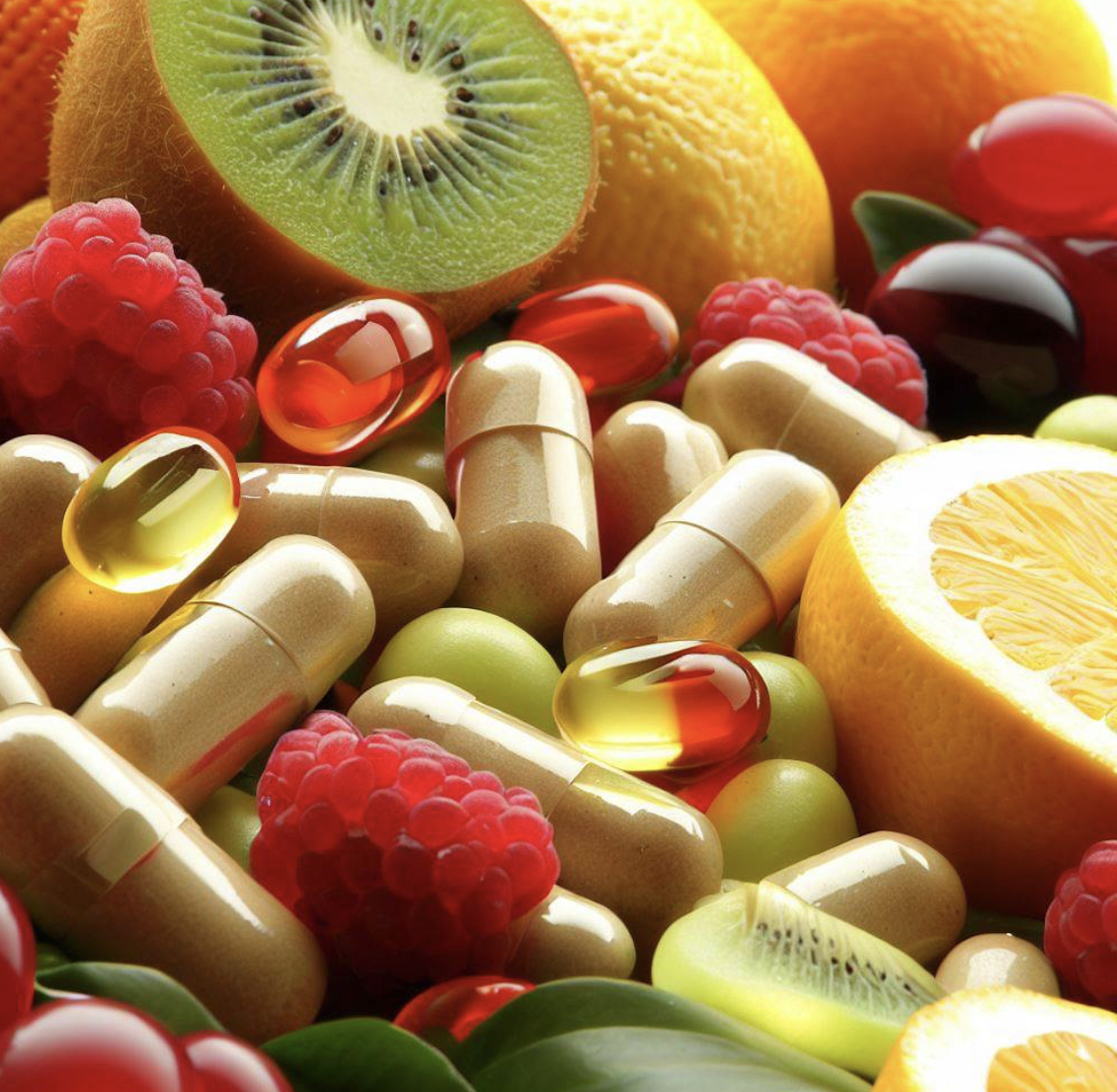Cápsula de complemento alimenticio rodeada de alimentos saludables en
