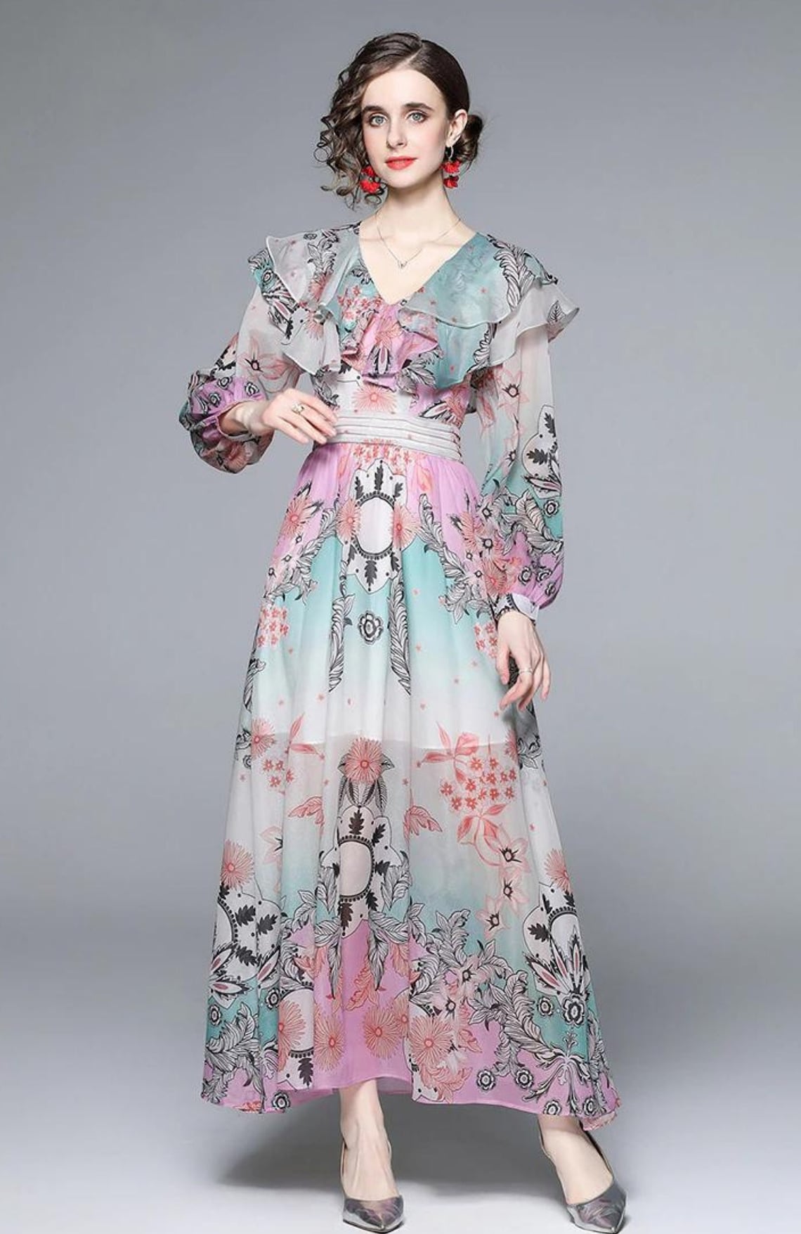 2018 Long Sleeve O Neck Floral Print Maxi Dresses Women Maxi Chiffon