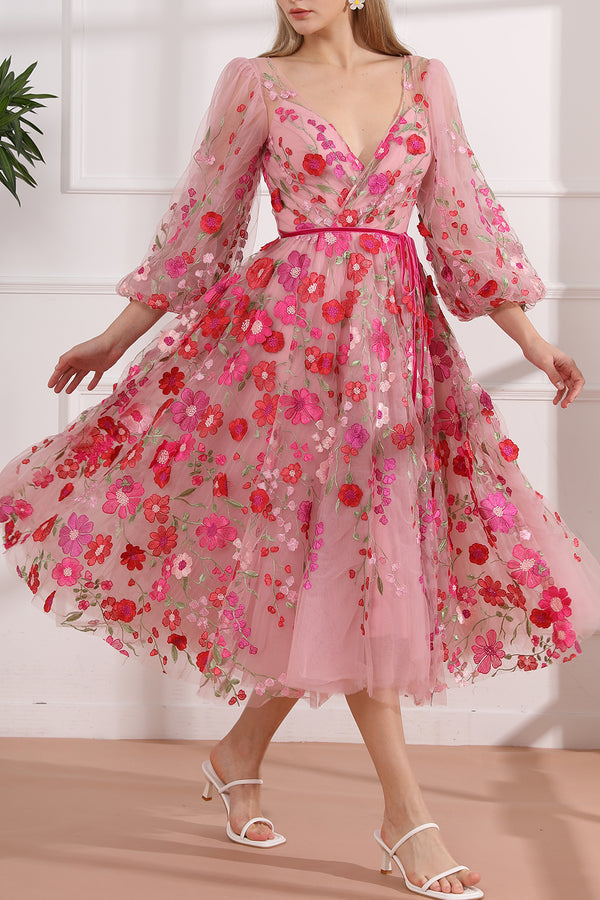 MissJophiel Embroidery Floral V Neck Puff Sleeves Midi Dress