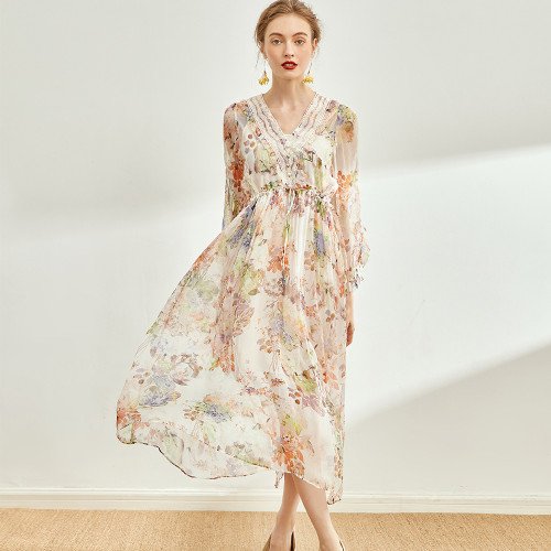 100 Natural Silk Dresses 2023 Womens High Quality Half Sleeve Floral