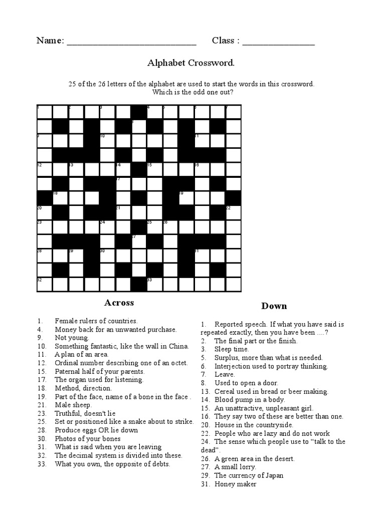 Name: Class: Alphabet Crossword PDF