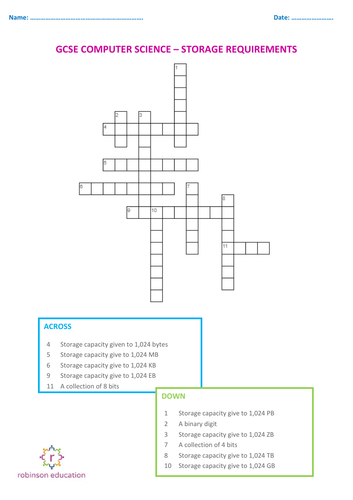 GCSE Computer Science Storage Requirements Crossword Teaching Resources