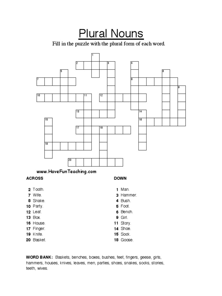 Plural Nouns Crossword Puzzle PDF PDF