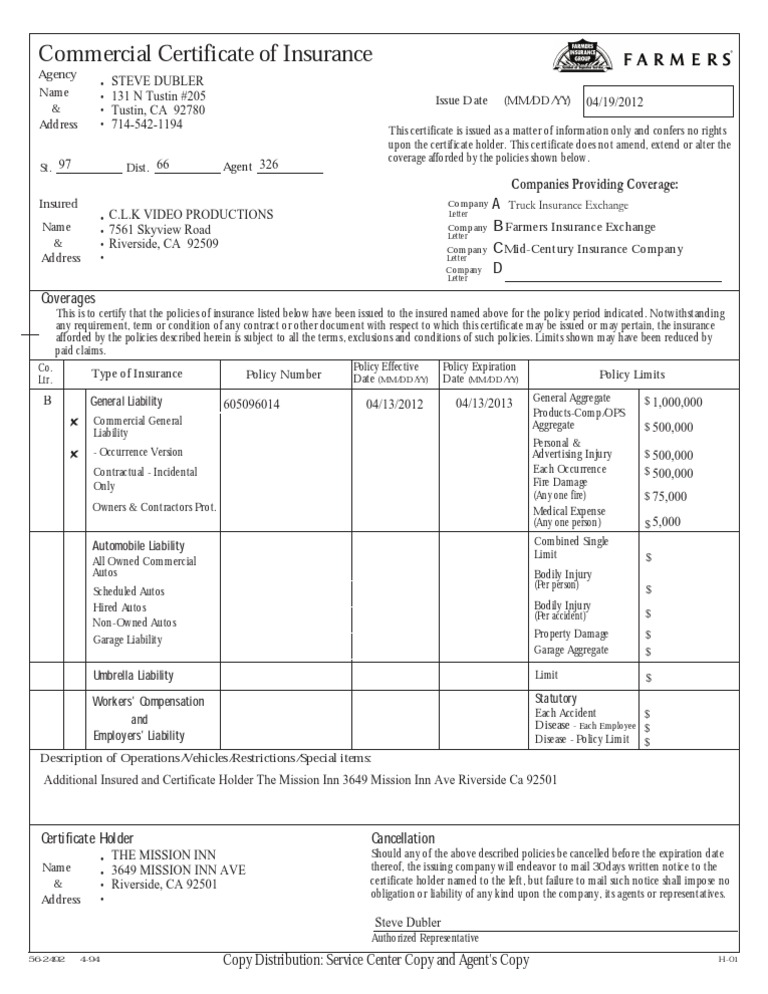 Certificate of Insurance PDF Workers #39 Compensation Insurance