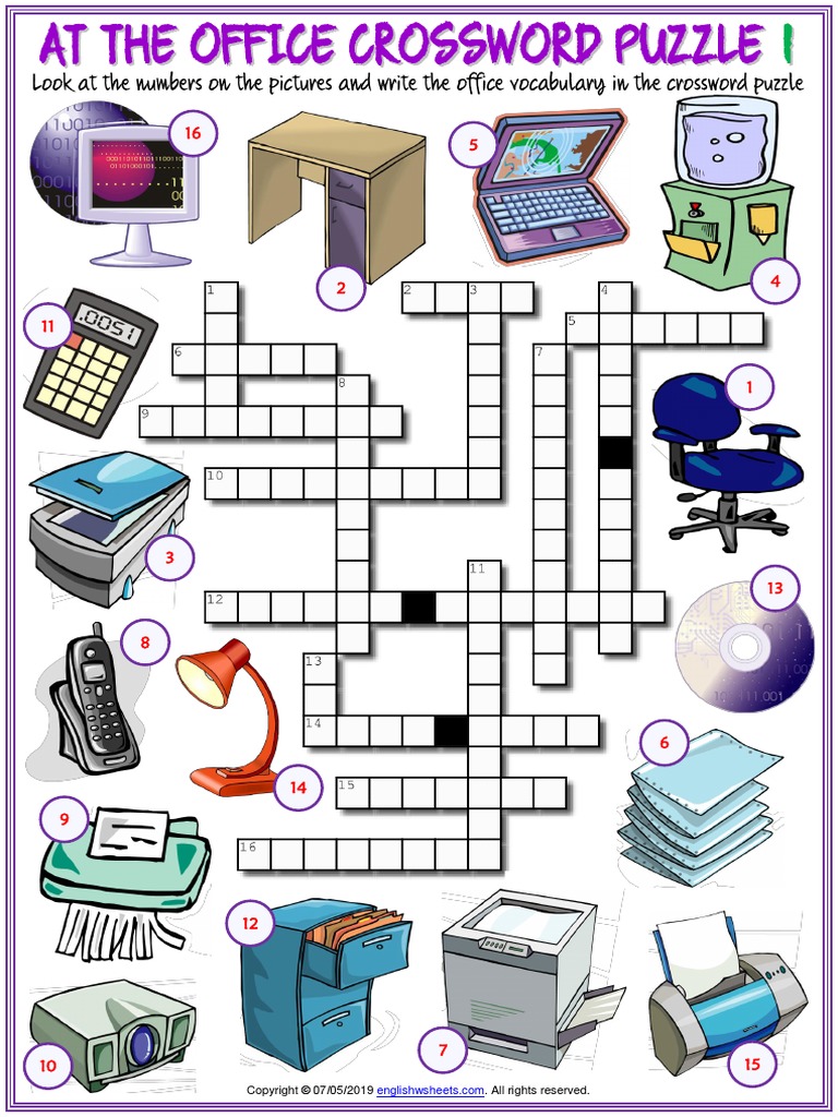 Office Objects Vocabulary Esl Crossword Puzzle Worksheets For Kids