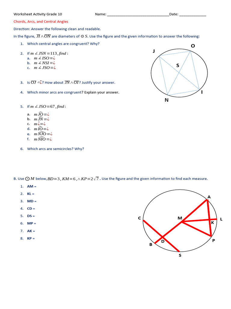 Geometry Worksheet Section 10 2 Arcs And Central Angles Answers
