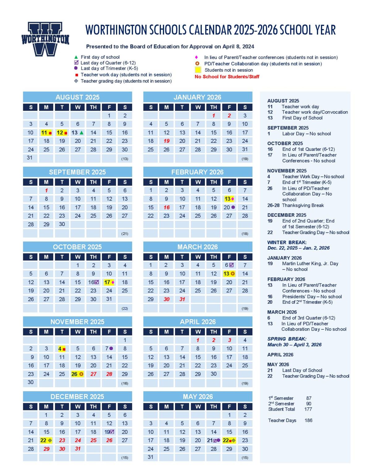 Worthington Schools Calendar US School Calendar