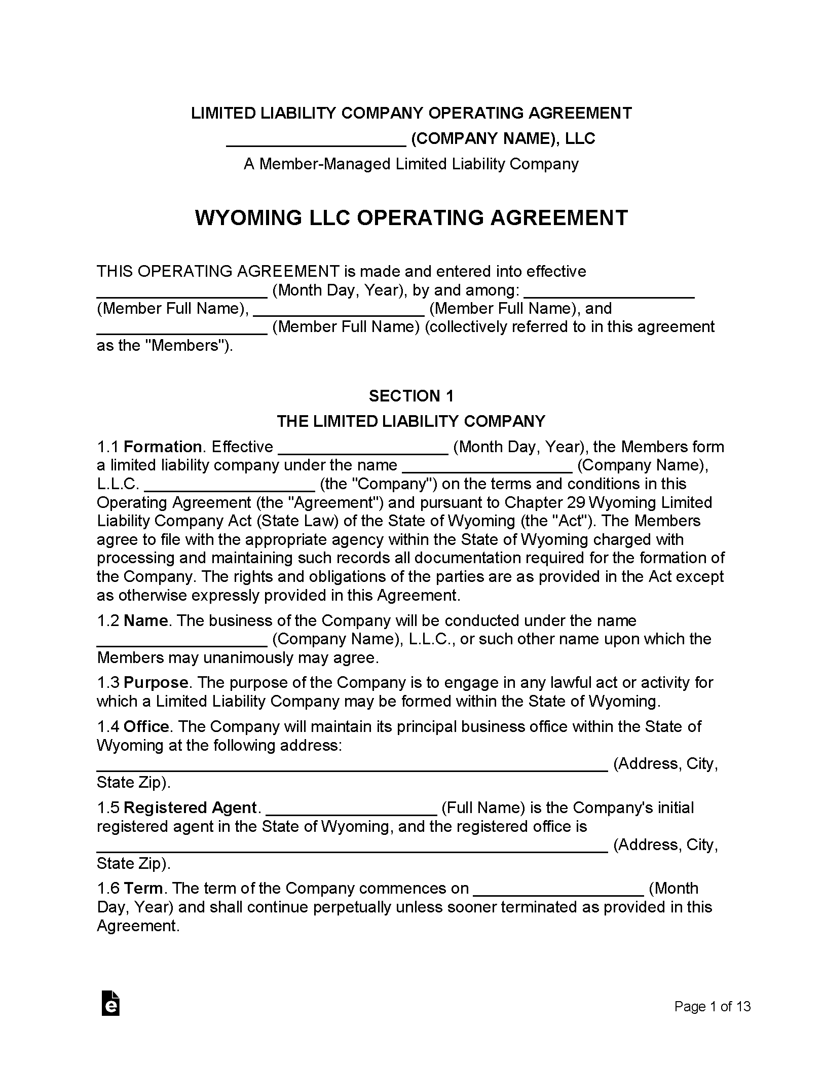 Free Wyoming LLC Operating Agreement Templates (Word / PDF) Excel TMP