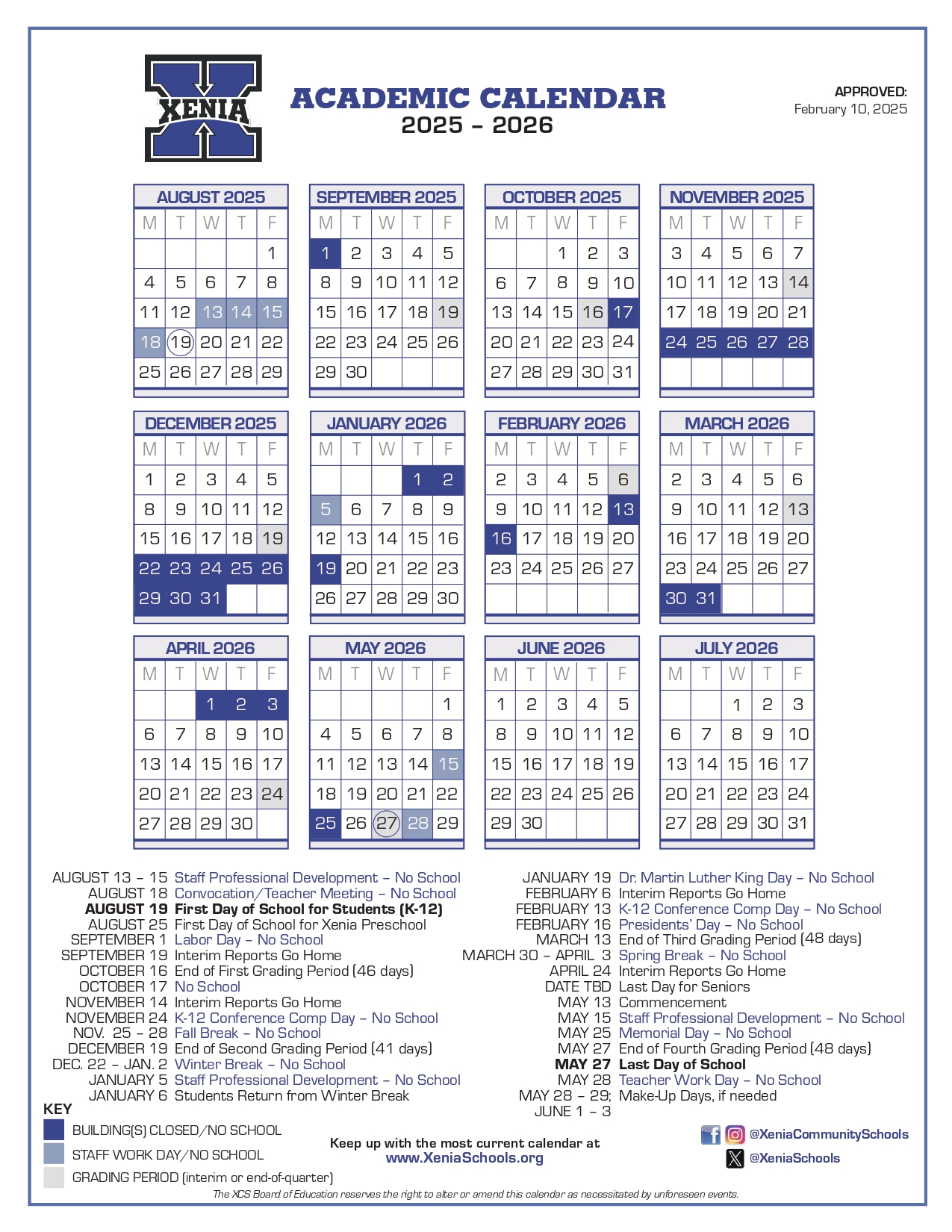 Xenia Community Schools Calendar 25 26 Revised PDF EduCounty
