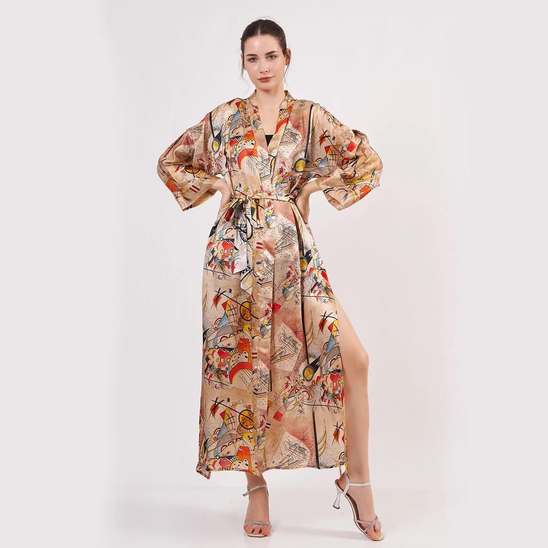 Kandinsky Bustling Aquarelle 100 % Silk Kimono Robe Chic and Cozy: Long
