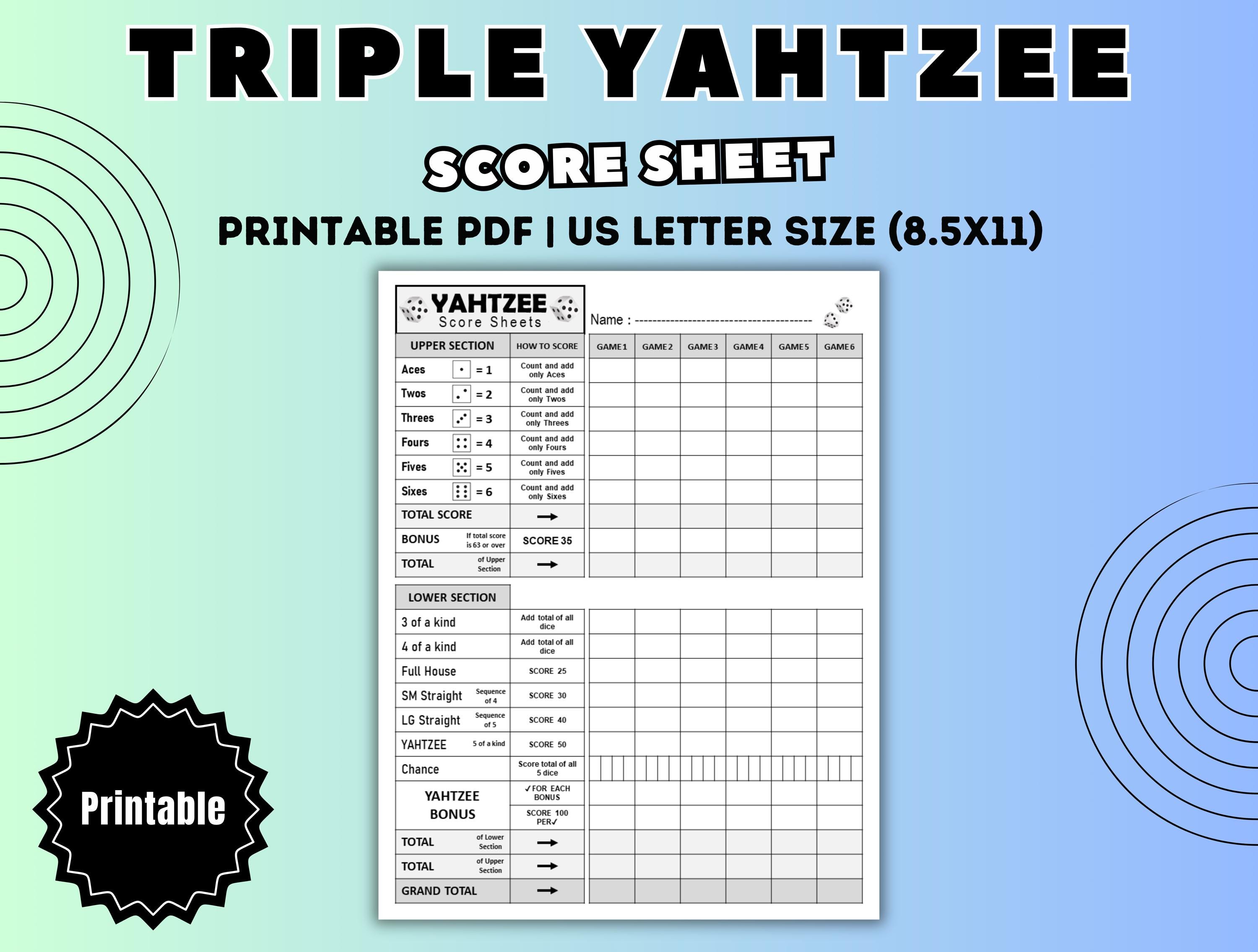 Triple Yahtzee Score Sheets Yahtzee Score Card Yahtzee Score Pad