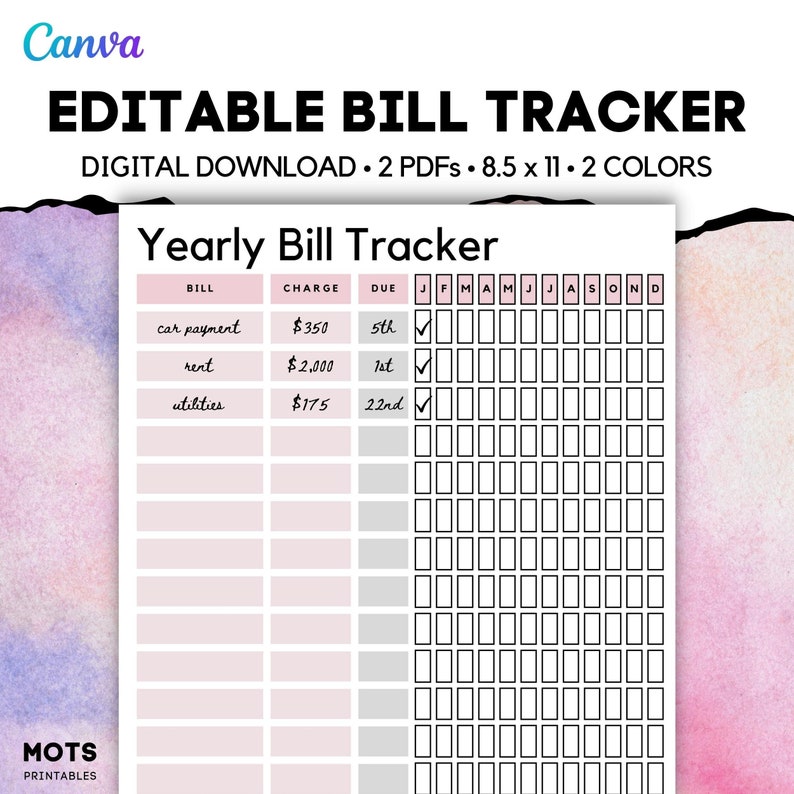 Editable Printable Yearly Bill Tracker Financial Planner Bill