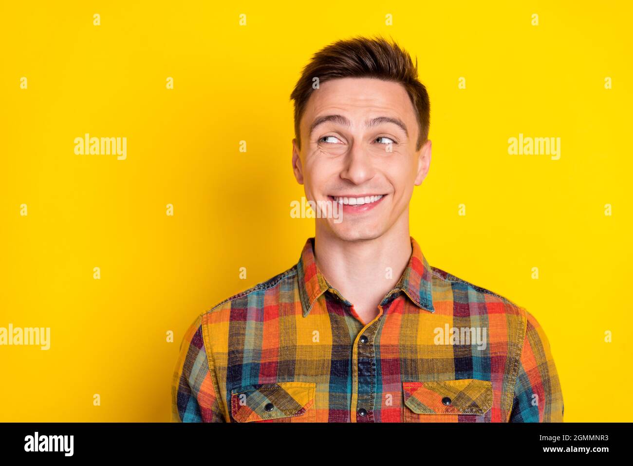 Portrait of attractive cheerful curious brown haired guy overthinking