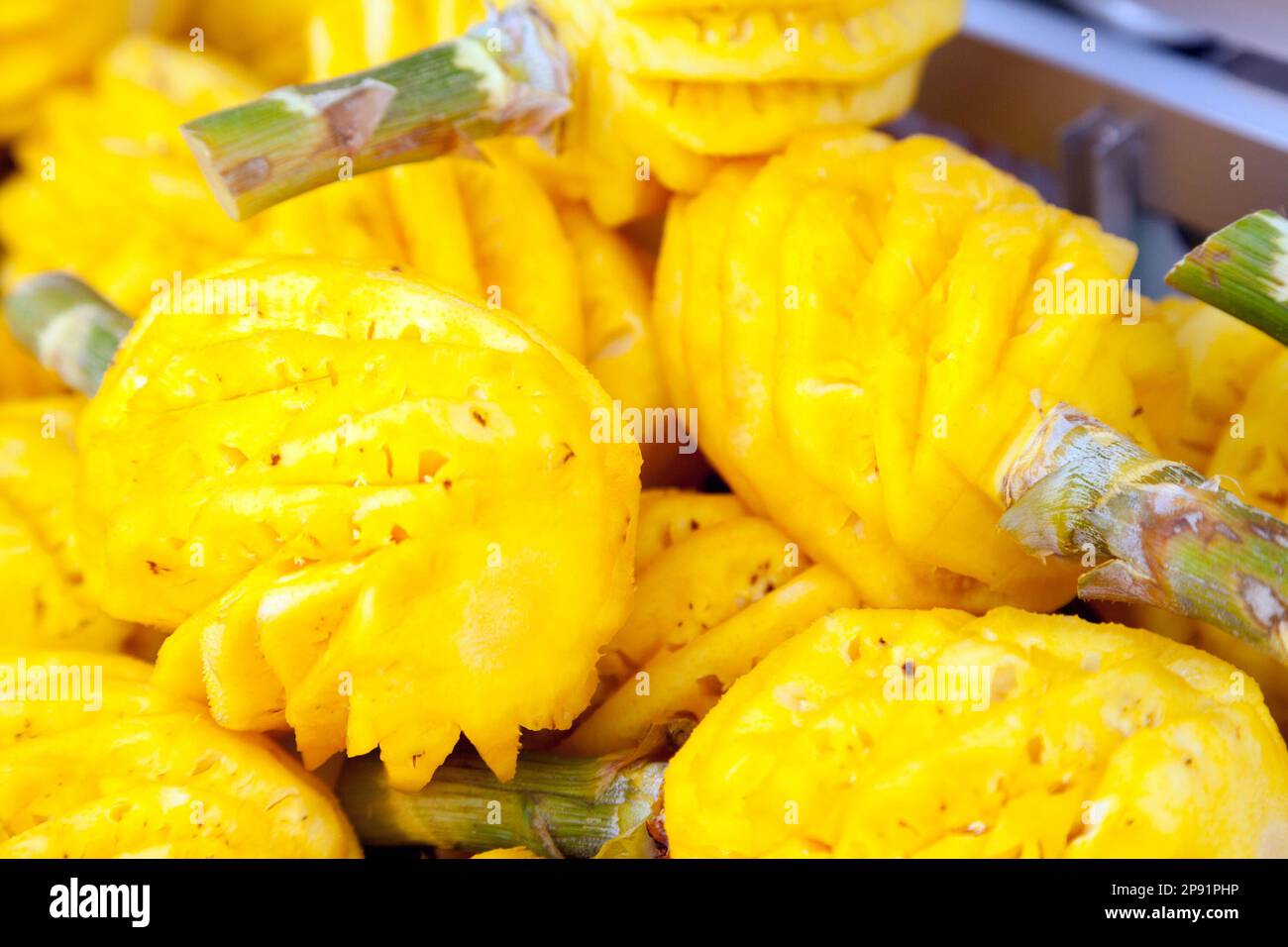Pile of beautifully peeled fresh pineapples Many yellow tropical fruit