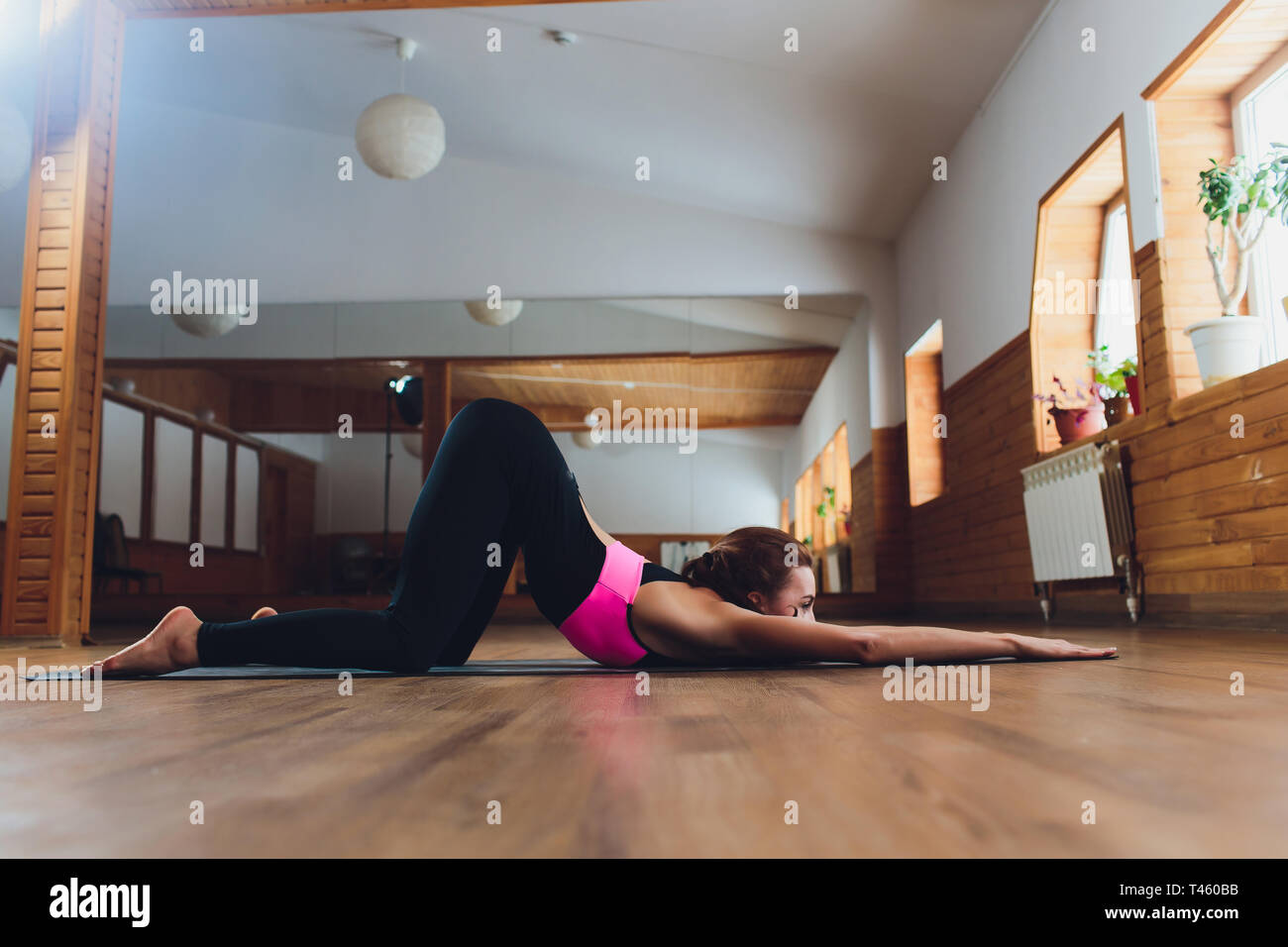 Woman Practicing Yoga Cow Pose Bitilasana in Studio Stock Photo
